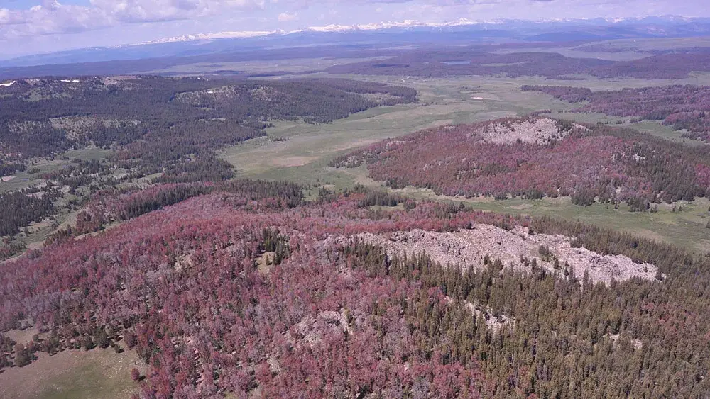 Many dead trees appear gray and red on the high-mountain slopes of Union Pass Bridger in Teton National Forest in Wyoming. Photo by W.W. Macfarlane.