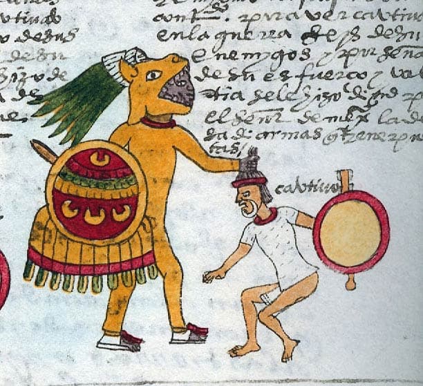 As Emily explains, the name Coyote likely come from the Aztec word, coyotl. Images of coyotes and humans dressed a Coyotes appear in colonial sources from the Spanish period in Mexico. An excellent example is this drawing from the Codex Mendoza folio 65r. The source was created by a Spanish scribe sometime in the mid 16th century (there is disagreement about when exactly).