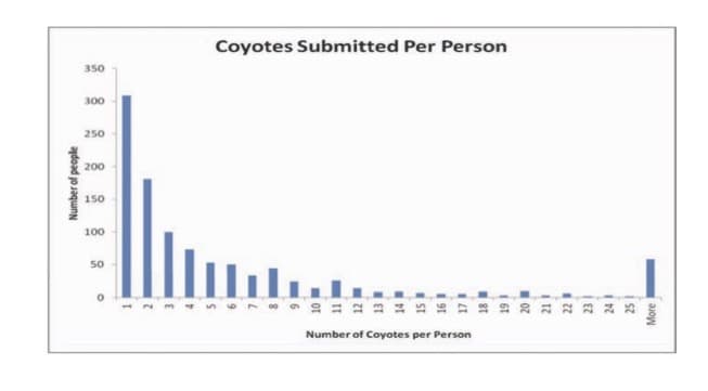 In this episode, Michelle mentions the number of coyotes killed due to government-sponsored "predator control" bounty programs throughout the history of the Mountain West. These programs paid hunters to hunt for predators who were, in the estimation of government officials and many constituents, dangerous. Millions of animals have been killed each year by the US Fish and Wildlife Service over the long 20th century, but lest we think this is a thing of the past, in July of 2012, the Utah legislature passed the Mule Deer Protection Act (a fascinating name that could be unpacked). The law allows the state to pay hunters bounties of $50/coyote. The program is run by the Utah Division of Wildlife Resources (we assume that means resources about wildlife not resources for wildlife. The program's website also contains some interesting historical sources showing Coyote at the center of a great deal of effort (legal, physical, and ideological). Particularly intriguing are the annual reports of the program. Note in the graph to the right that "only" 60 participants in the program reported killing 25 or MORE coyotes in the 2013 report found here. And yet - coyotes persist.